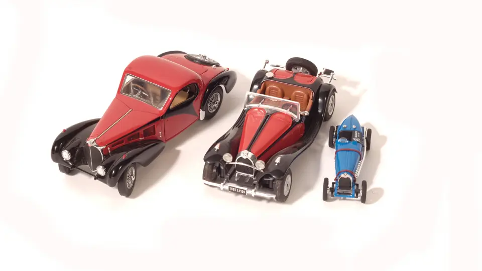 Lot includes a 1:24 scale Franklin Mint Precision Model of a 1936 Bugatti Atalante 57 SC, a 1:24 scale plastic Majorette model of a Bugatti Type 55 de la Chapelle, and a commemorative Brumm model that celebrates 90 years of Bugatti.