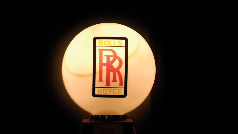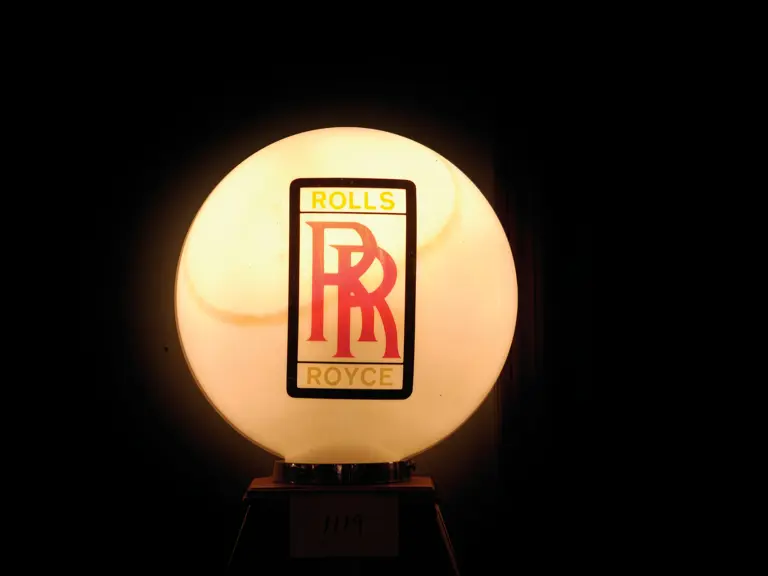 Lot includes a Rolls-Royce milk glass globe mounted on a wood base. Close inspection reveals some minor staining and discoloration on the glass, but this could be largely reversed with a thorough cleaning. Also included is a stained glass Rolls-Royce emblem measuring 29x48 inches.