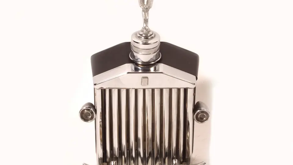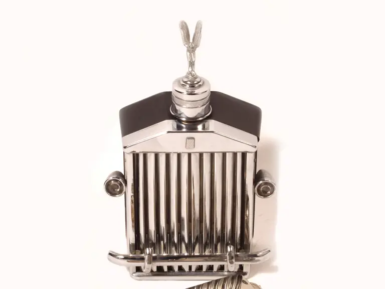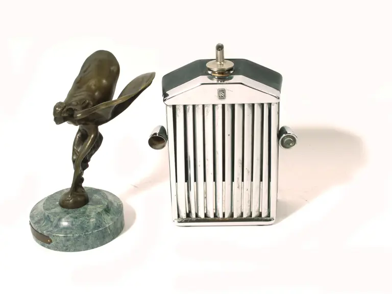 Offered here are two Rolls-Royce radiator flasks, one complete with a bumper and Flying Lady topper, a metal Rolls-Royce coin bank, and a small bronze replica of the Spirit of Ecstasy sculpture by Charles Sykes.
