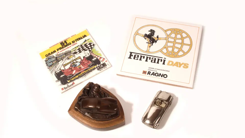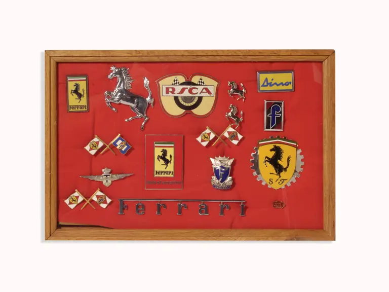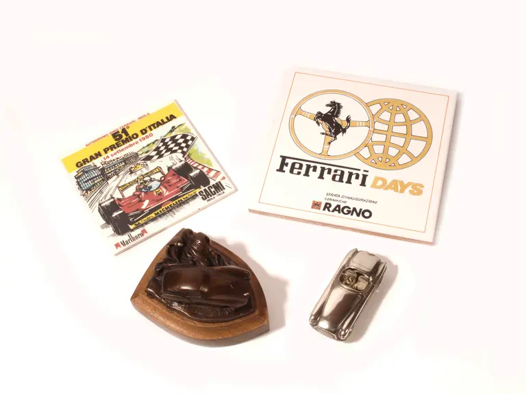 Lot includes a selection of original Ferrari, Dino and Pininfarina badges as well as a 1952 Ferrari 212 Barchetta crafted in fine pewter by the Danbury Mint, a small bronze Ferrari sculpture by L.A. Braun and two custom made ceramic tiles, one commemorating the 1980 Italian Grand Prix and the other celebrating Ferrari Days.
