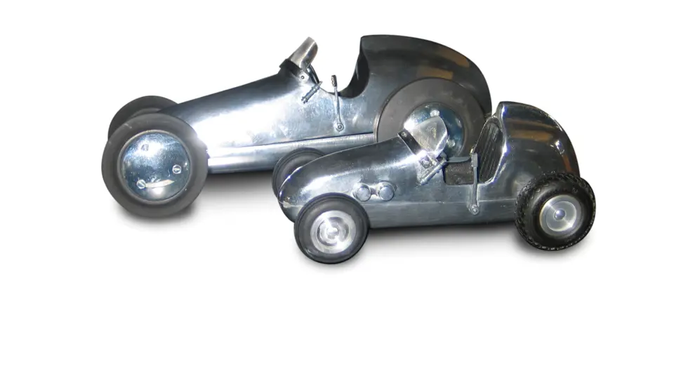 Lot includes two solid cast metal race cars. They each feature a plastic windscreen and detailed shifters. Both examples are in very nice condition, with no notable wear or damage.