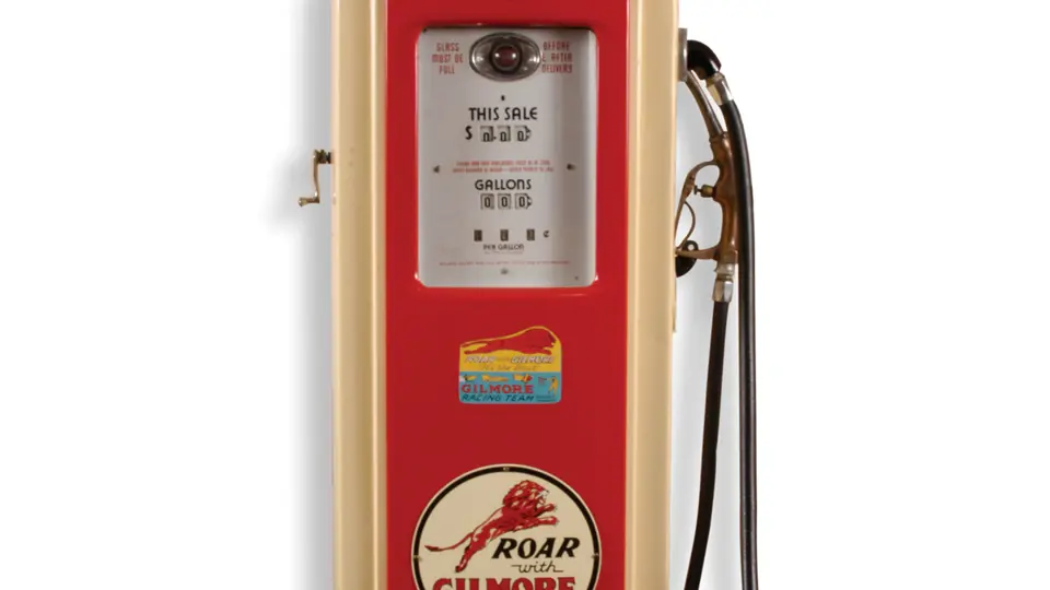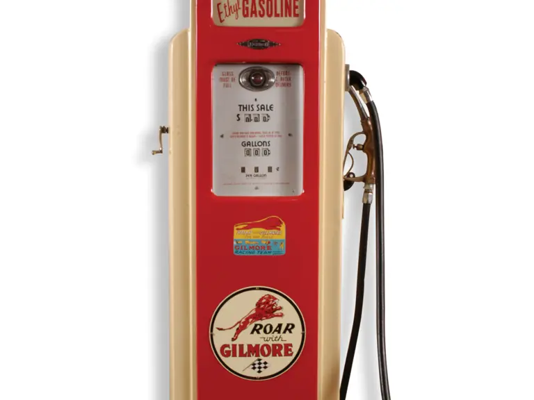 90 inches height. This 1940s Bennett model 541 pump features four ad glass panels and a handsome restoration in Gilmore trim. A very collectible example in presentable condition.