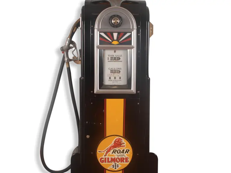 92 inches in height. This 1935 Wayne 60 Electric Calculating Pump has been restored in Gilmore Gasoline trim. It is a very presentable example with an extremely glossy finish and a unique sunburst illuminated panel above the gauges. A highly collectible unit, it features a reproduction globe.