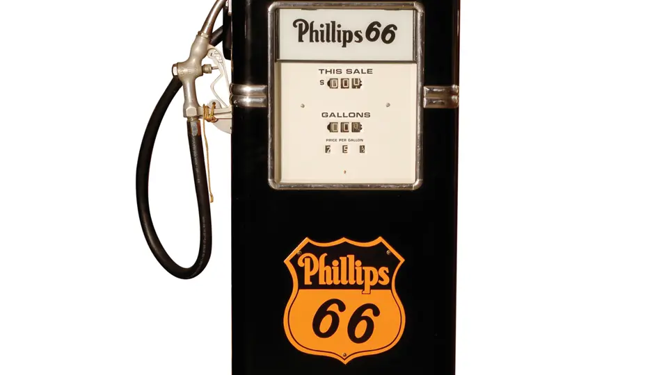 This attractive, late 1940s Bowser pump has been restored in Phillips 66 colors and trim. It features an original milk glass globe with reverse painted glass lenses.