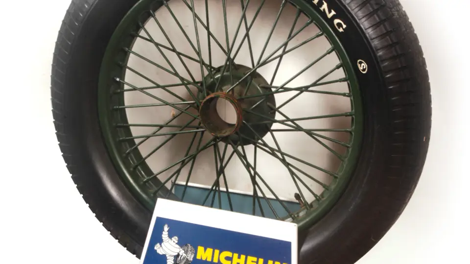 29 inch diameter. Lot includes a pair of tire holders that display two vintage Dunlop racing tires and wheels. One tire is used, one is in new old stock condition.