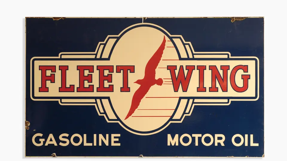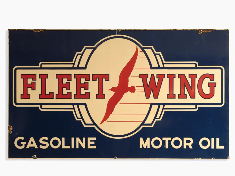 Porcelain; 64x37 inches. This attractive example features the silhouette of a soaring bird. Colors are bright, finish is glossy. Surface shows scratching and some crazing in the bottom right corner. Minor deterioration and chipping is present at perimeter, particularly around mounting holes. RM Grade: 6+.