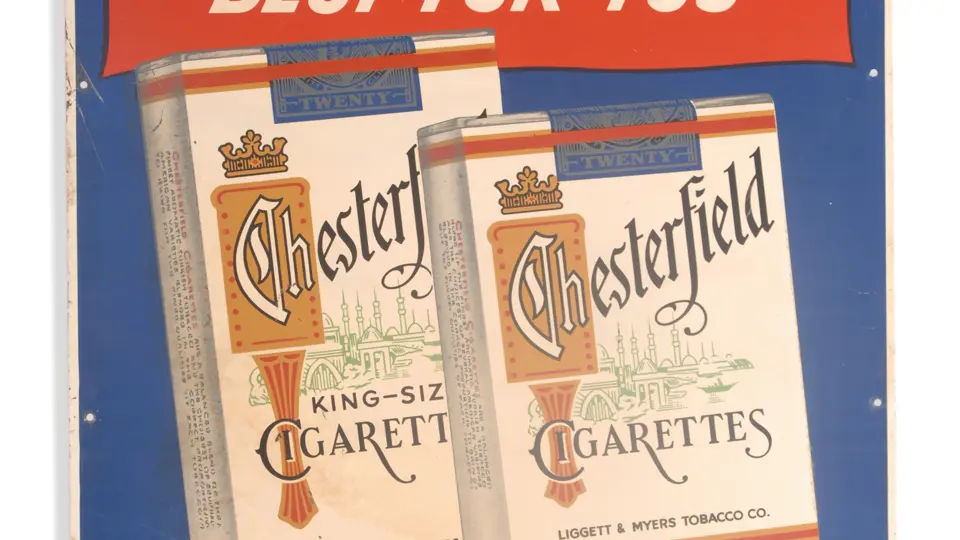 Tin; 23x29 inches. This wonderful example of vintage tobacco advertisement features a large, detailed graphic. Its colors are bright, finish is shiny. The surface shows a small amount of crazing and deterioration at bottom edge. RM Grade: 7.