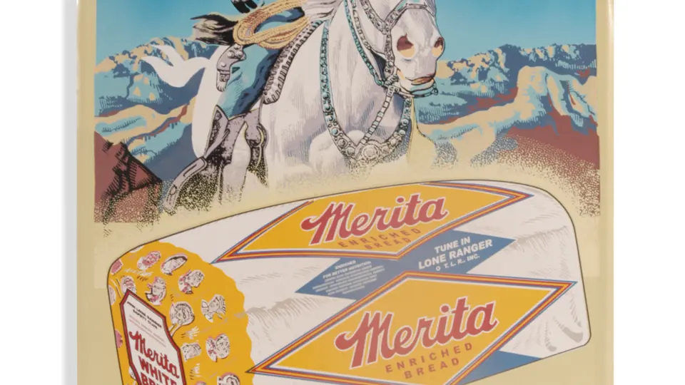 Tin; 24x36 inches. Featuring a wonderful image of the Lone Ranger riding Silver, this colorful and detailed sign is a very collectible, attractive example. Colors are bright, finish is shiny, and surface is free of notable imperfections, even at close range. Perimeter shows minor markings and a few dents. Mounting holes show use. RM Grade: 8+.