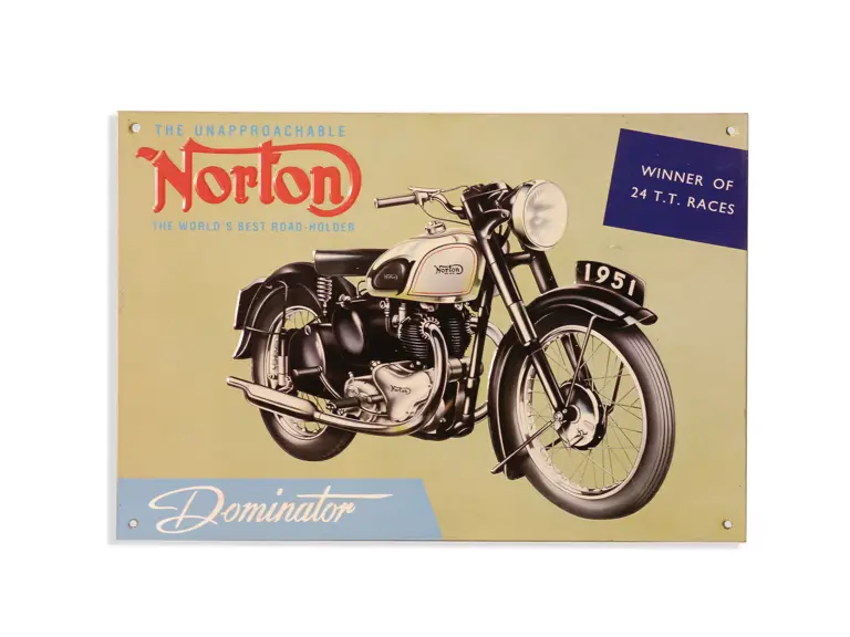 Embossed Tin; 15x12 inches, 16x11 inches. Lot includes two motorcycle signs. The Bantam motorcycle is depicted in great detail, and presents nicely on a surface that shows only a few minor scratches and scuffs. The perimeter and mounting holes are also in presentable condition, showing only a small amount of wear. RM Grade: 7+. The second sign depicts a 1951 Norton motorcycle in great detail. Thesurface is largely undisturbed by flaws and presents very nicely. The perimeter and mounting holes are similarly clean and sharp. RM Grade: 7+.