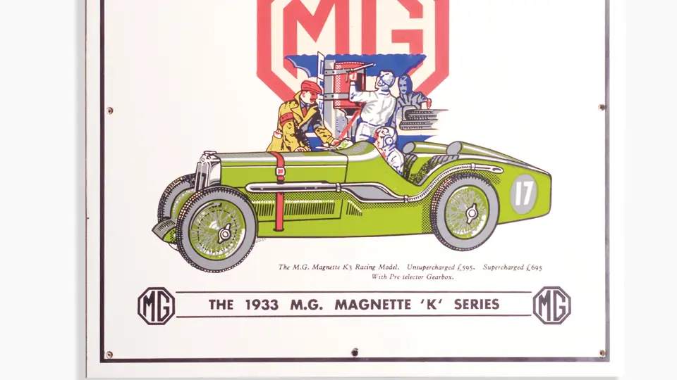 Porcelain; 17x17 inches. This colorful sign features a 1933 MG Magnette 'K' Series being serviced by the pit crew. The surface is very presentable, showing no notable flaws. The perimeter and mounting holes are in equally good condition. RM Grade: 9.