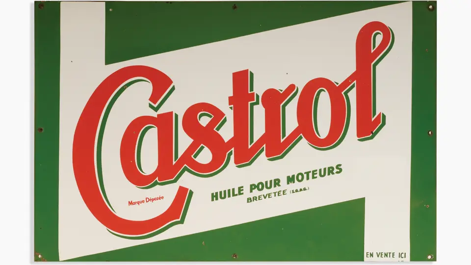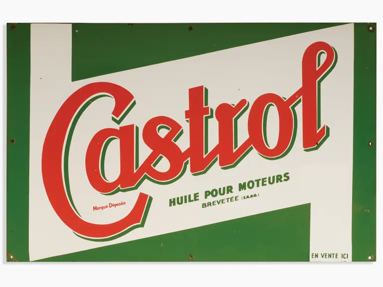 Porcelain; 36x24 inches. This rare, French language sign has bright colors and a glossy finish. The surface shows a few very minor chips, but is otherwise very presentable. Perimeter is nice and clean, with slight wear evident around mounting holes. RM Grade: 7+.