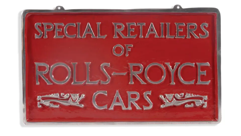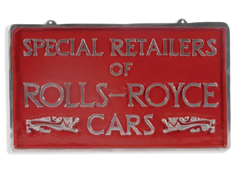 Metal; Double-sided; 26x16 inches. An interesting and attractive sign, this heavy cast metal example declares a firm �Special Retailers of Rolls-Royce Cars�. The surface is in very nice condition, sporting a bright red background and stylized lions. RM Grade: 8+.
