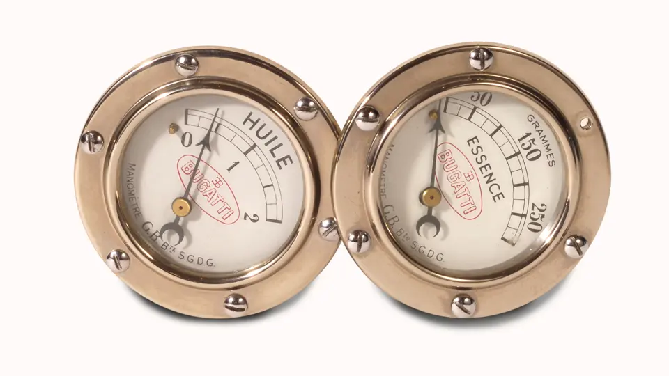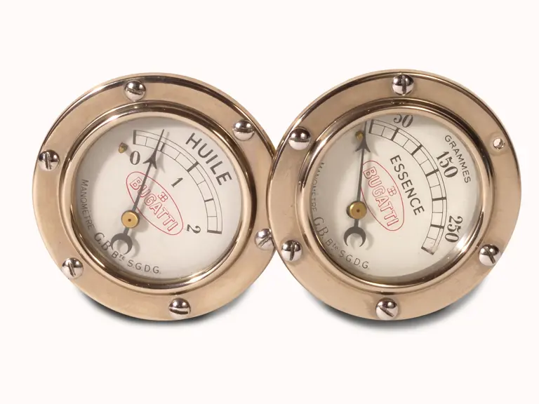 Lot includes two original Bugatti gauges, one for essence (gasoline), and the other for huile (oil). Each is in very presentable condition.