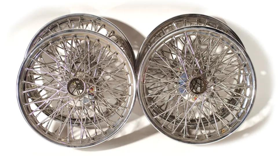 Lot consists of four polished Borrani wire wheels without knock offs in presentable condition. Size: 19.5" (No RW #).