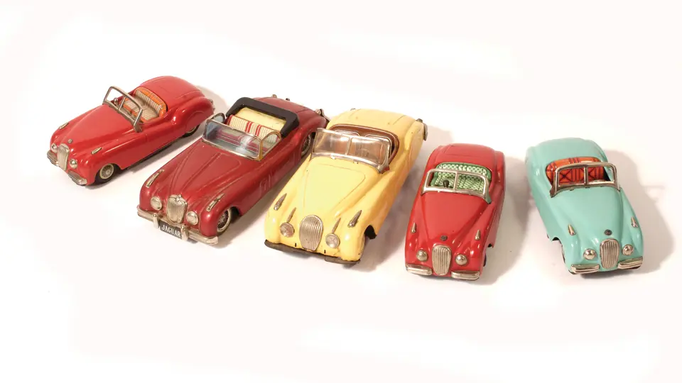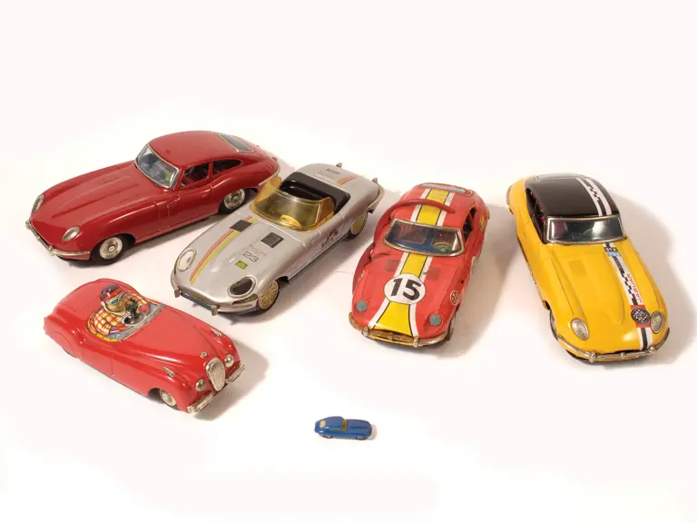 Lot includes a colorful selection of very rare tin toy cars. The smaller examples are battery-operated, and feature bright, attractive paint, charming detailed interiors and metal accent grilles, windscreens, headlights and hood ornaments. Lot includes three E-types, one decked out in a yellow and black paint scheme with graphic details, a battery-operated tin race, a friction propelled race car and a pump action-powered car with driver. All cars are in original condition, showing minor wear and no evidence of any restoration or repair.