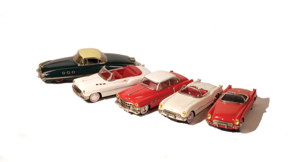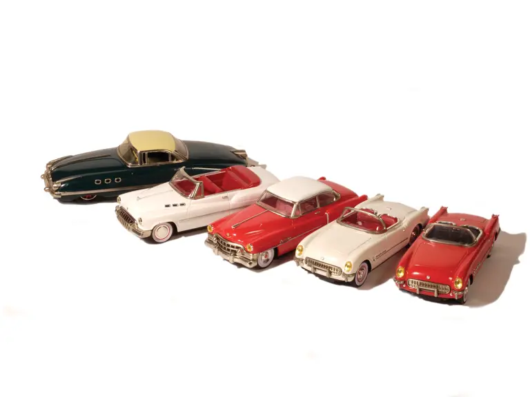 Lot includes a selection of Japanese made die-cast toy cars including Cadillacs and Corvettes. Also included is a sleek, aerodynamic model with a painted interior and metal trim. All examples are in highly presentable condition with no notable flaws.