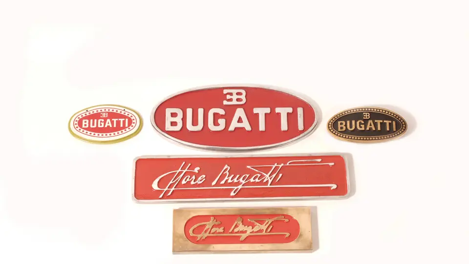 Lot includes a selection of Bugatti nameplates including examples cast in metal, bronze and tin. Two nameplates feature the signature of Ettore Bugatti, and one bronze example is actually a Bugatti badge.