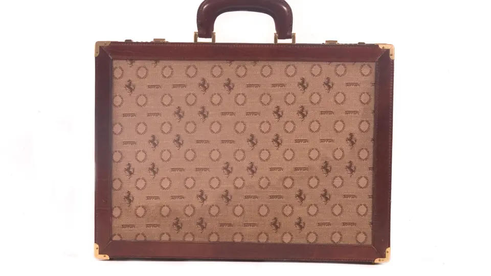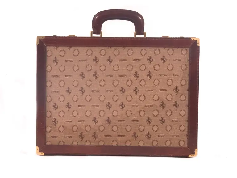 A unique, stylish accessory for the diehard Ferrari lover. This briefcase features a fabric and leather exterior and a sumptuous leather-lined interior with pockets for organizing important files. It appears to have been used carefully; the leather has acquired a nice patina on the exterior and the interior is pristine. The fabric panel on one side does show subtle darkening on the lower half.