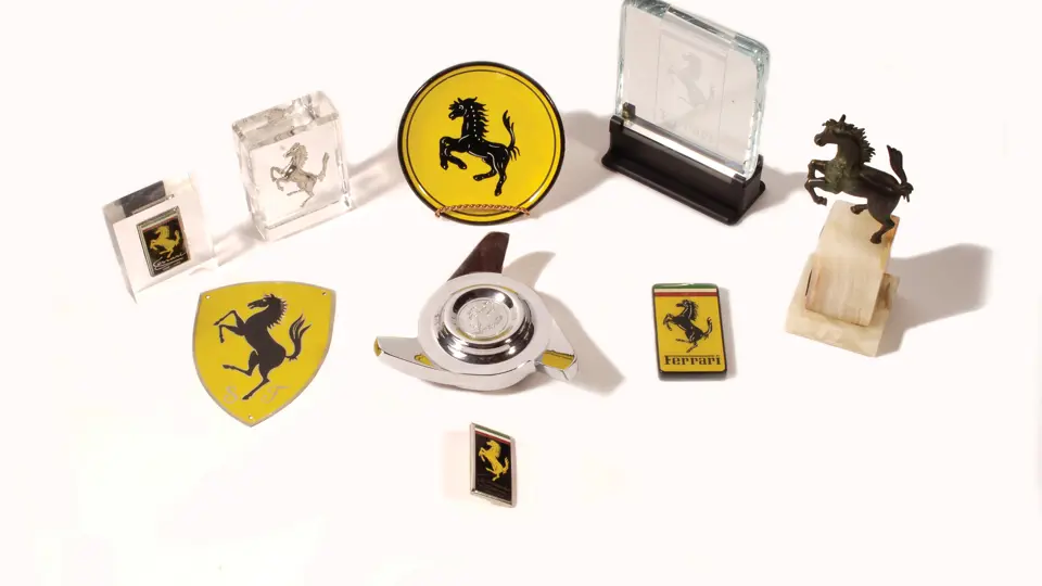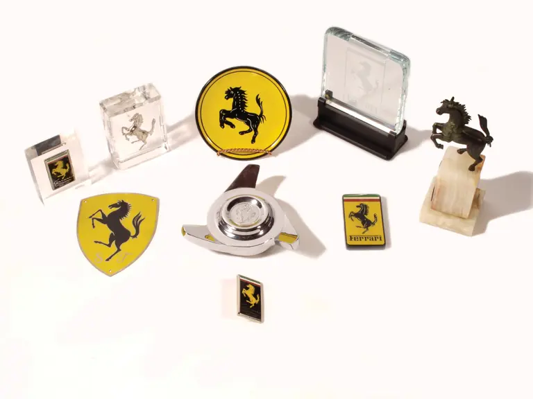 Lot includes a selection of Ferrari accessories including paperweights of various shapes and materials, a bronze Prancing Horse sculpture on a marble base, a hand painted ceramic plate and a Ferrari badge celebrating its 100th anniversary.