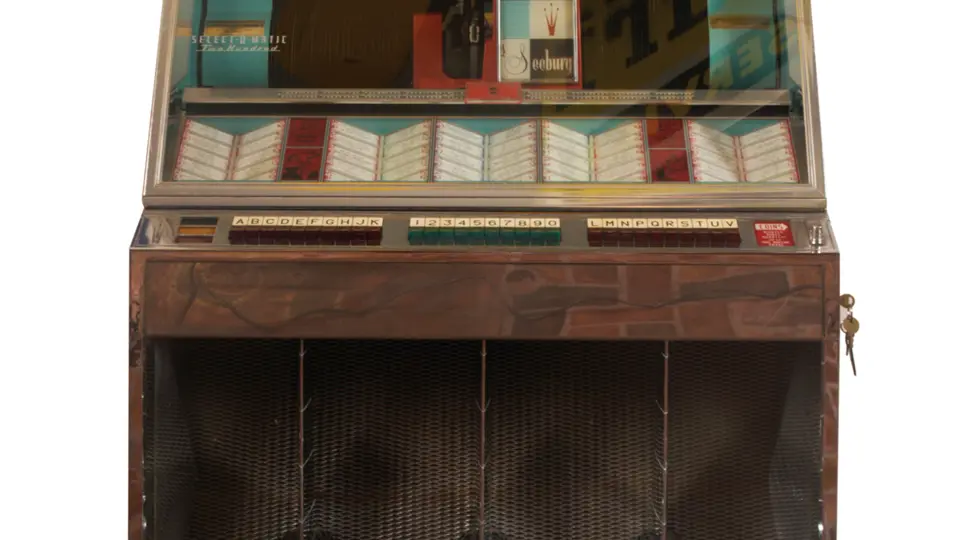 35x55x27 inches. Presented here is a highly collectible example of a classic jukebox. It comes complete with a selection of 50s and 60s music, and features the desirable Cadillac-style fin design, with flashing red lights reminiscent of taillights.