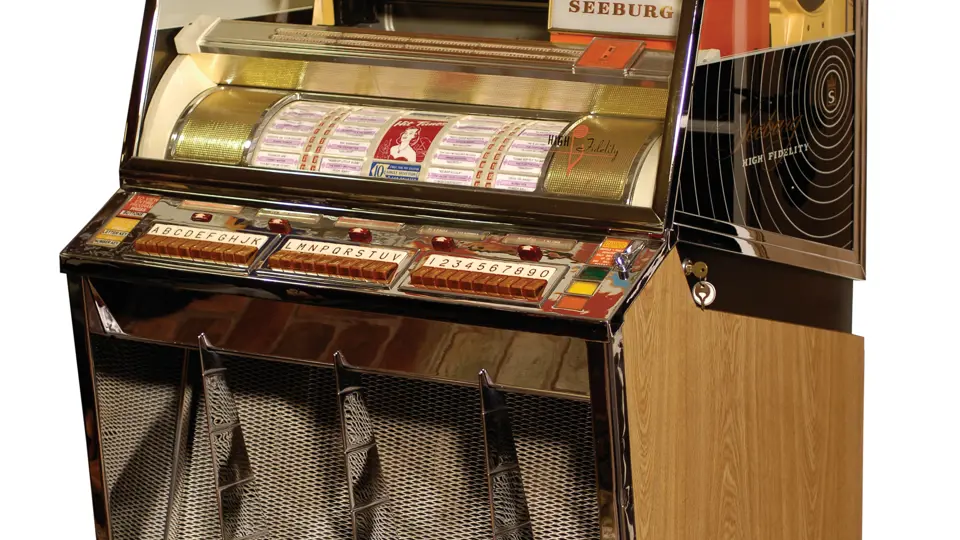 35x58x27 inches. An updated cabinet design was introduced in 1957, exhibiting Detroit styling in the prominent chrome taillights. Notably, the Seeburg also features the roller drum mechanism. This machine offers 200 selections, a relatively new innovation at that time, and is in good, functioning condition, with impressive sound amplification.