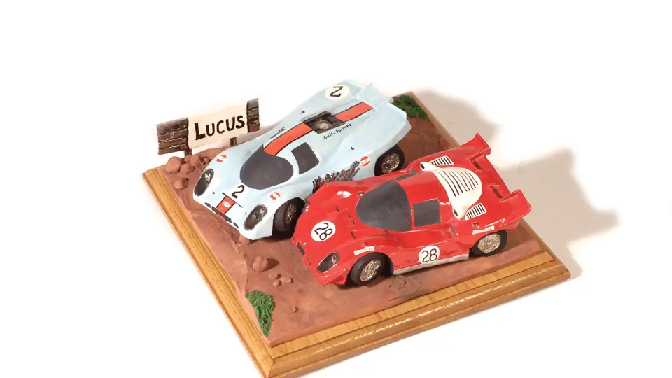 This sculpture, a work by Craig Booth in 1993, depicts two race cars getting too close for comfort on the track, resulting in a sideswipe on the Gulf car. The glossy finish and bright colors of this sculpture add to its appeal, along with the detailed rendering of the cars. Mounted on a wood base for display.
