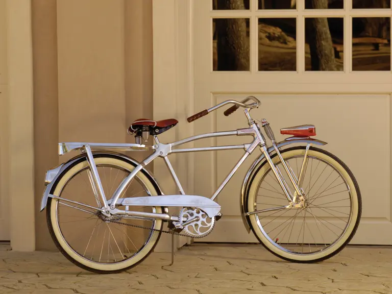 This fabulous classic bicycle features a unique hexagonal tube frame and many period details that contribute to its appeal. One of the rarest bicycles known and offered for sale. Shocks on the front forks and the leather saddle as well as generous whitewall tires smooth out the ride on this cruiser. A battery powered headlight and rear reflector make the bicycle safer at night and a rear rack provides a cargo area.