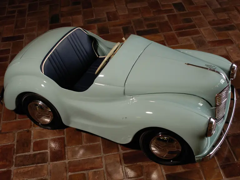 A lovely example of a classic pedal car, this Austin is resplendent in robin�s egg blue paint and a navy interior with white piping. The details are what make this pedal car so delightful: from the chrome hubcaps to the license plate, the working headlights to the jaunty hood ornament, this is a perfectly charming little cruiser. It is in presentable condition; the paint shows just a few minor scratches, and the chrome is bright and smooth.