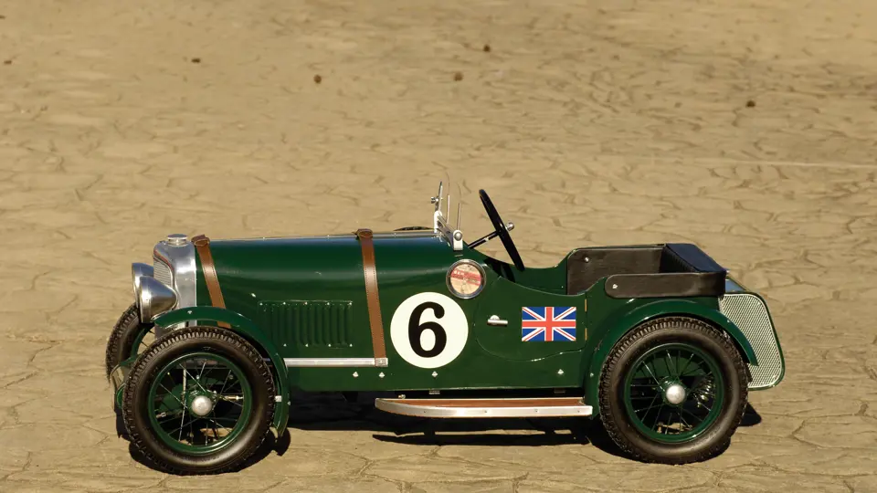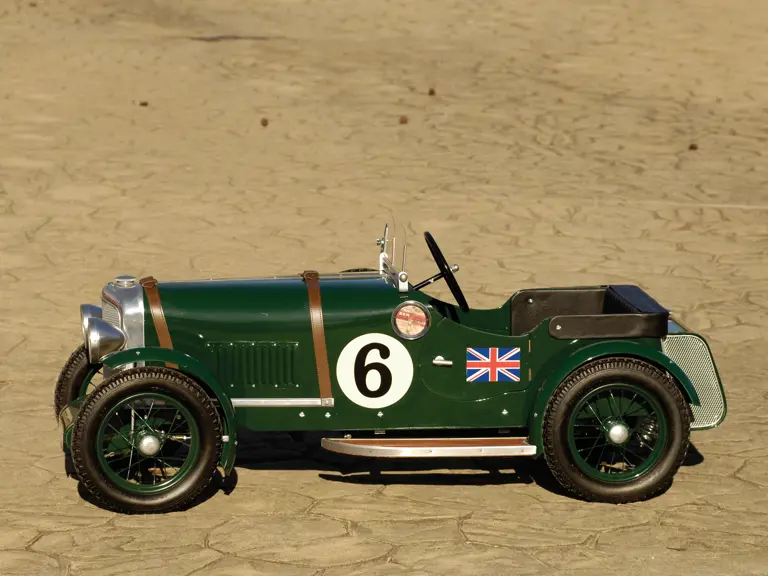Produced by Little Pedalers, this Bentley is nicely equipped with features that contribute to its smart appearance. Wood running boards assist entry and provide storage for the Shell Car Care Kit and side-mounted spare. Leather hood straps, a dual windscreen, side mirror and Bentley badge are further period details. Working headlights and a vintage style vehicle registration badge complete the look.