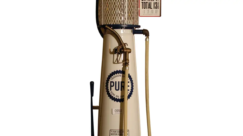 118 inches in height. This early, ten gallon visible pump has been restored in Pure Oil Co. trim. It features a Plexiglas cylinder with stone guard and a three-piece reproduction globe. A nicely finished, collectible piece.