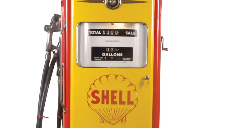 74 inches in height. This 1954 Bennett 966 model pump has been restored in Shell colors and trim. An older restoration, it features a reproduction threepiece milk glass globe and remains a very attractive example.