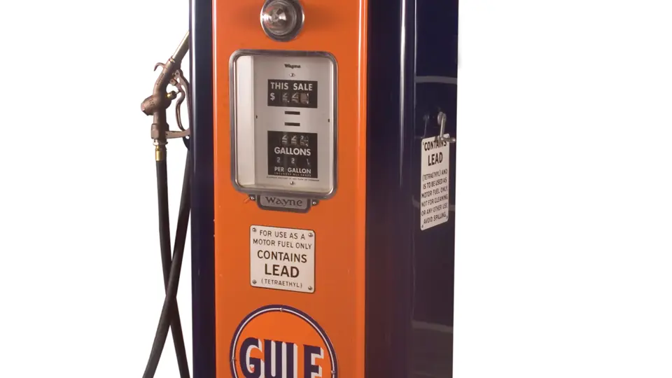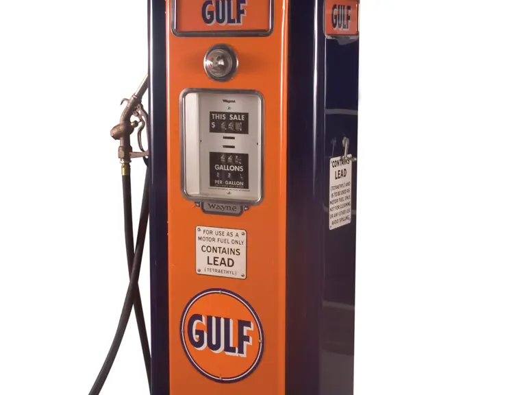 90 inches in height. Offered here is a Wayne 70 gas pump restored in Gulf trim. This attractive pump boasts a very nice finish, four panels of ad glass and a three-piece reproduction globe.
