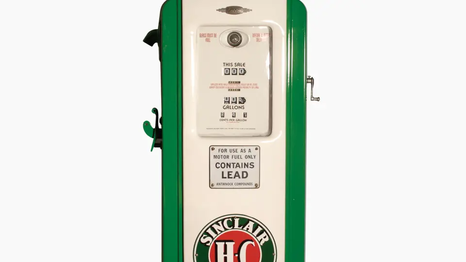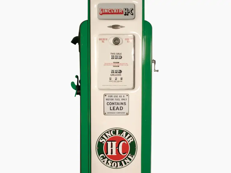 91 inches in height. The Bennett model 541 pump pictured here has been restored in Sinclair trim. A nicely finished example that shows no notable imperfections, it features four ad glass panels and a reproduction globe.