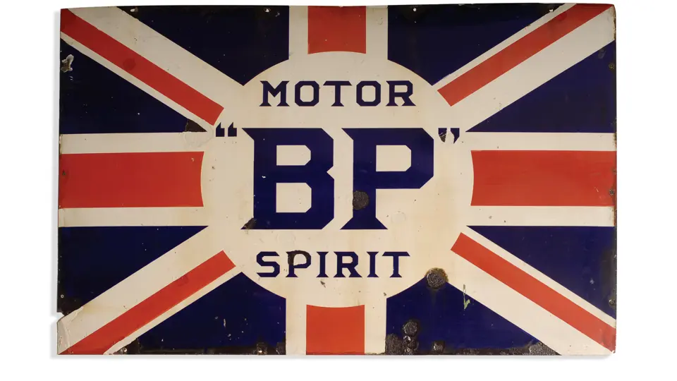 Porcelain; Approx. 48x36 inches. This early very desirable example features bright colors and a glossy finish. The white areas have discolored somewhat over time, showing slight yellowing and staining. There is extensive use of inpainting on the surface, which disguises chipping and rust. Much of this inpainting is located at the perimeter. RM Grade: 5+.