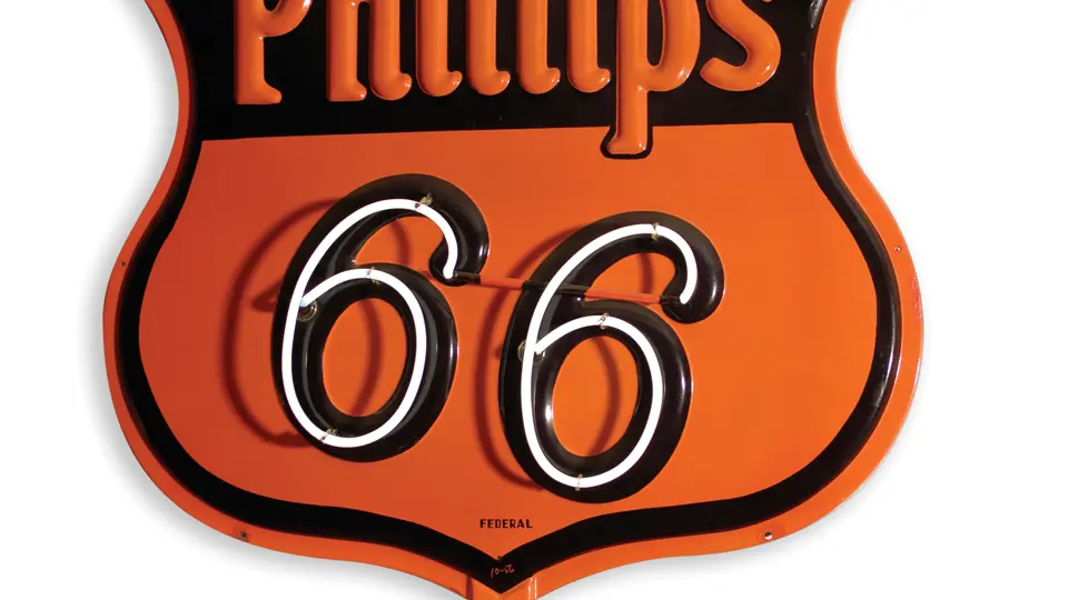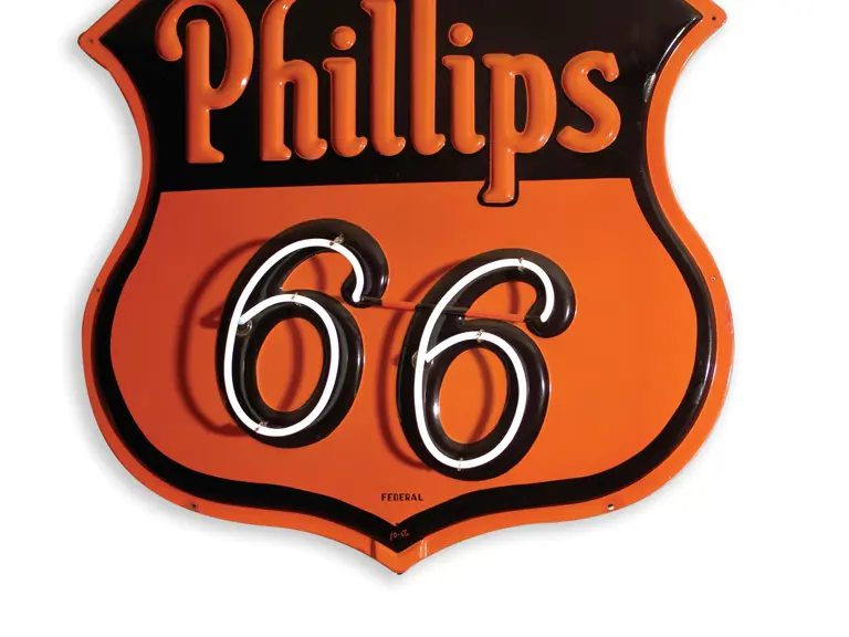 Porcelain; 48x48 inches. A classic example of porcelain petroliana, this sign features embossed lettering and a wonderful die-cut shape. The colors are bright and the finish is glossy on this fully refurbished example. The surface is very nice and free of notable flaws save a few small instances of inpainting in the black area. A few small chips are visible around the top mounting holes. RM Grade: 7+.