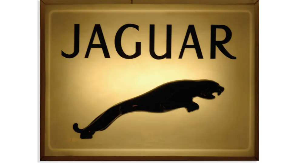 Plastic/Metal; 23x16 inches. Offered here is a very rare 1950s dealer sign with an embossed Jaguar logo and lettering. The surface has acquired a slight patina and shows slight graying in areas. Metal housing shows some wear and paint loss, particularly along the bottom edge. RM Grade: 7.