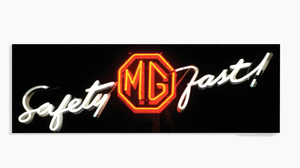 Neon; 48x16 inches. Displays the famous MG slogan �Safety Fast!� in neon lettering on a plastic background. Very presentable condition overall, with no notable imperfections. RM Grade: 9.