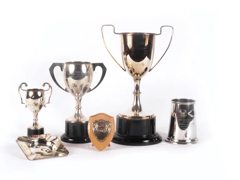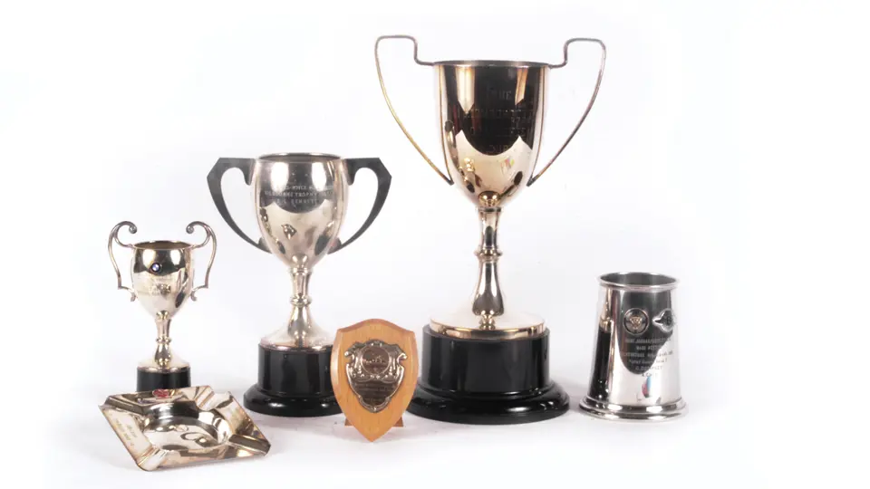 Lot includes a selection of trophies awarded at various racing events in England during the 1960s. Among these events are the Silverstone High Speed Trials, a joint Jaguar/Bentley meeting at Silverstone, a BMW Car Club Meet in Bristol and the Richborough Challenge Cup.