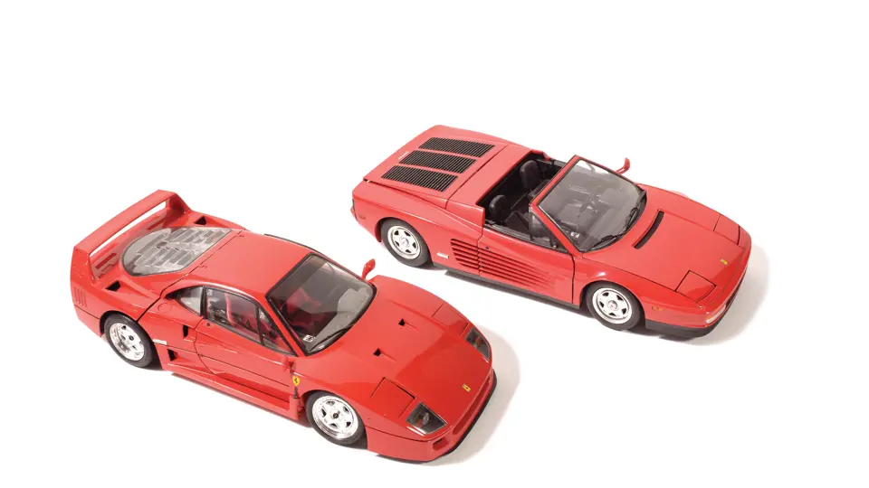 Lot includes an Ferrari F-40 and a Ferrari Testarossa Spider, both carefully crafted in 1:8 scale using die-cast metal, plastic and leather parts. These are both stunning minatures of the real cars. One side mirror of the Testarossa is missing, but otherwise they appear to be in complete, presentable condition.