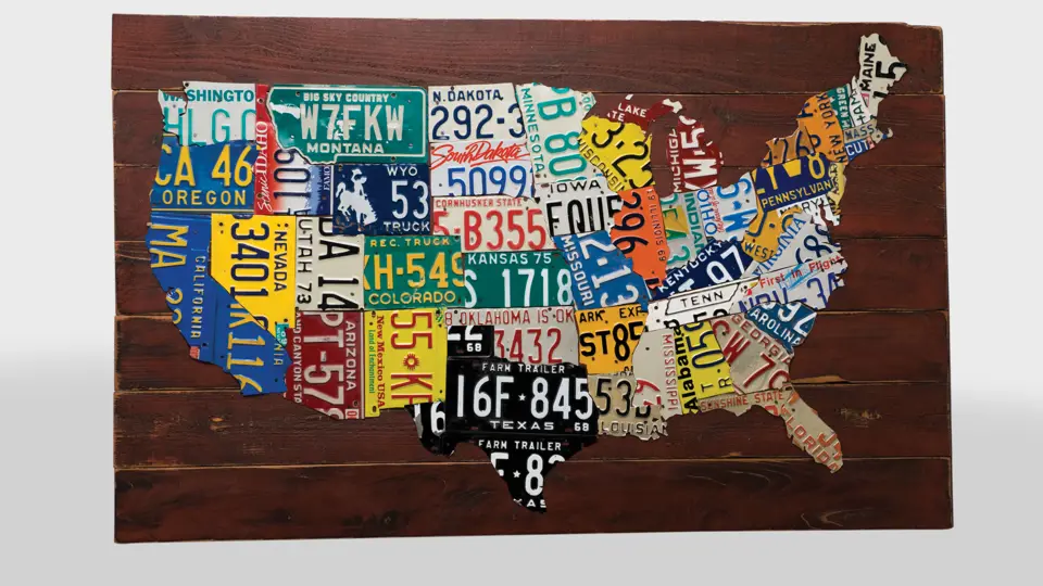 A unique piece of Americana, this map is composed of vintage licence plates cut to the shape of their respective state. Very good condition.
