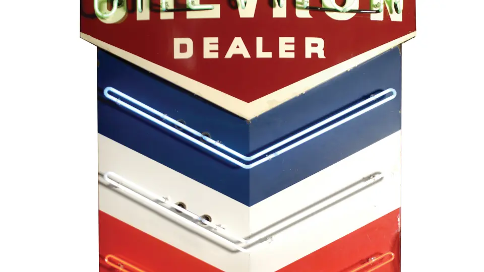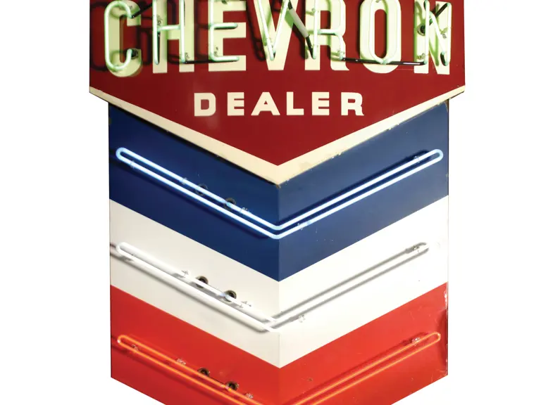Porcelain;42x72x5 inches. Unique die-cut shield shape. Colors, finish are bright and glossy. Close inspection of surface reveals some scratching and an area of inpainting on red section, which effectively disguises flaws.