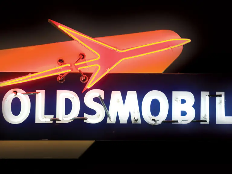 Steel;60x28x6 inches. Part of the GM Heritage Collection, this reproduction Oldsmobile dealer sign features a flashing rocket trail. Great vintage shape. Excellent condition, as new. RM Grade:9+