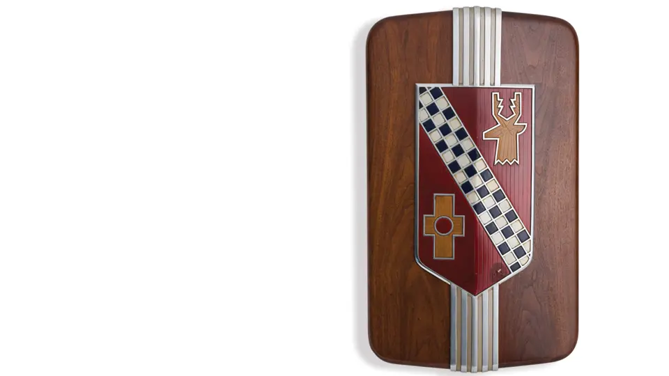 Original;Wood/Metal;18x31 inches. Decorative metal crest mounted on a solid wooden shield. Excellent condition, with very minor deterioration visible on crest.