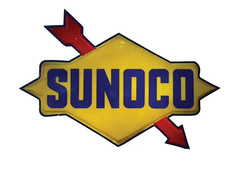 Original;Plastic;48x34x7 inches. Classic Sunoco imagery, with downward-pointing red arrow. Very nice condition, virtually no cracks.