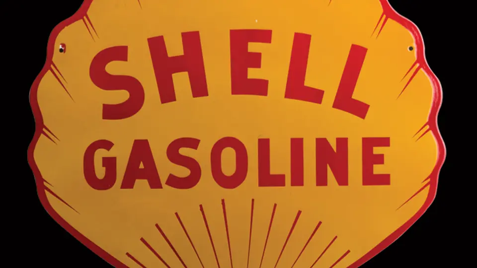 Original;Porcelain;25x25 inches. Famous clamshell design and shape. Colors are bright and shiny. Mounting holes show minor wear. Close inspection revels some scratches.
