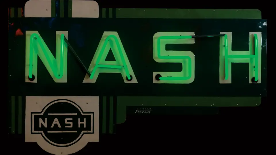 Original;Die-Cut Porcelain;60x36x6 inches. Uniquely shaped Nash dealer sign with an interesting color scheme. Significant inpainting, apparent only upon closer inspection. Steel face panel somewhat wavy in lower left quadrant.