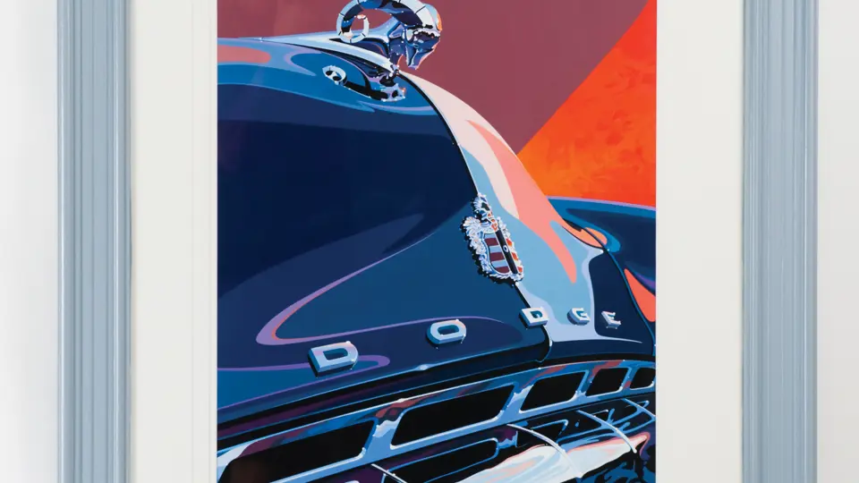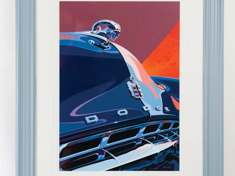 Tom Hale;Acrylic on canvas;19x27 inches. This very interesting study of a mid-1950s Dodge hood in acrylic on board captures the instantly-recognized "Ram's horn" hood ornament and unique grille design, skilfully incorporating the visually stimulating interplay of light and shadow.