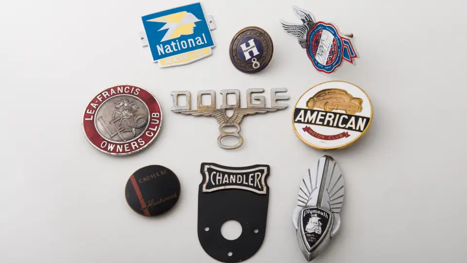 Group lot of assorted automotive badges including Plymouth, Mercury, Chrysler and Cadillac.