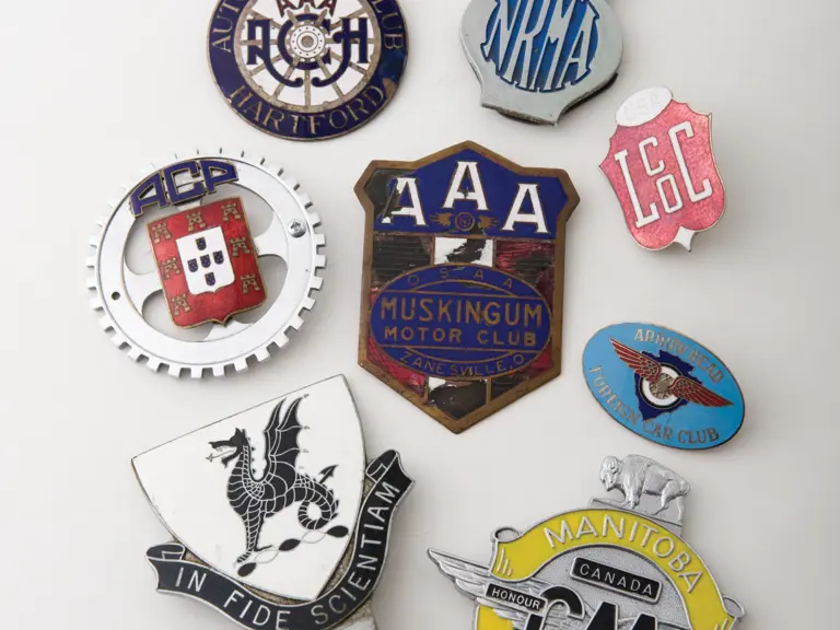 Group lot includes several automobile club badges including one from the USA LCOC Car Club, circa 1950s and one from the Arrow Head Foreign Car Club, circa 1950s.