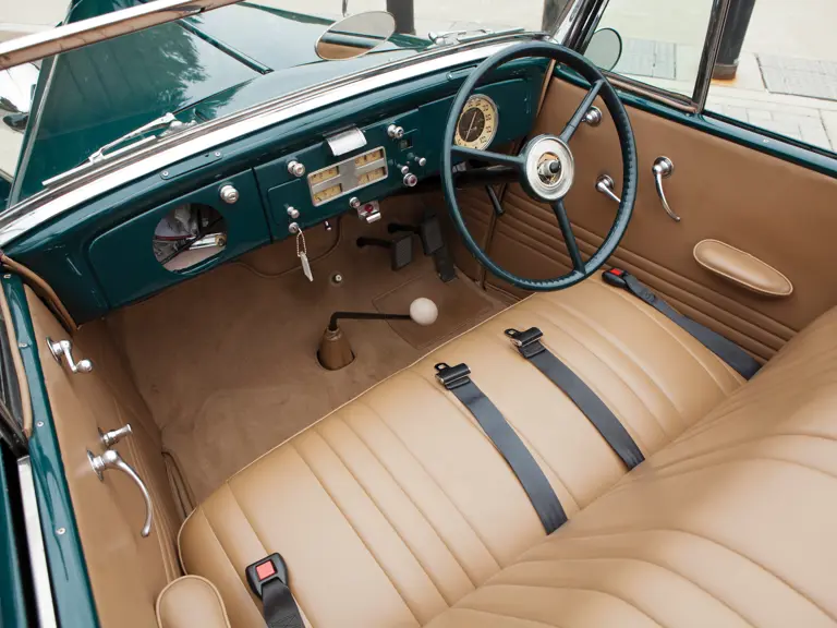 Packards continued to be owned by notables like Bob Hope, Jack Benny, Jean Harlow, Al Jolson, Dick Powell, Irene Dunne, and President Franklin Roosevelt. In fact, Packard proudly noted that Hollywood dealer Earle C. Anthony reported more than 100 major movie stars owned Packards, which certainly didn’t hurt the sales of its lower-priced models. The current owner purchased this right-hand drive Packard in 1983. This is an older restoration that is still holding up nicely. It has been serviced and driven regularly and has been a testament to Packard’s famous reliability.